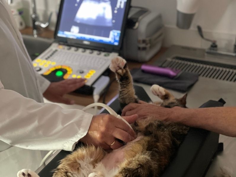 Abdominal ultrasounds typically take 30–45 minutes, while echocardiograms may take 45–60 minutes, including the consultation and review of findings. Your pet will be admitted and remain in our care for a few hours while the procedure and consultation are completed.
